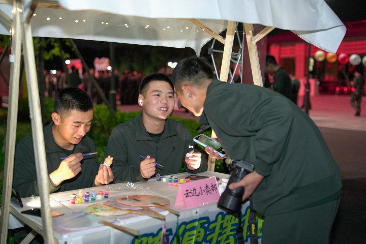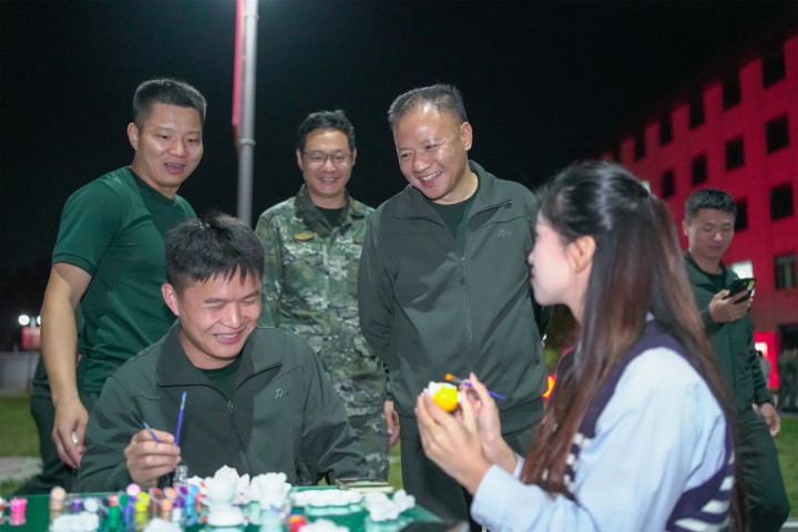 手工区满是创意与温情,“物品上色”体验成了官兵们的“心头好”。白胚玩偶、陶瓷杯、中秋主题挂件整齐摆放,官兵们围坐桌前,手持画笔细细勾勒。有的为玉兔玩偶涂上雪白绒毛,点缀红色领结;有的在陶瓷杯上绘一轮圆月,旁添几枝桂花;还有的把军营训练场、执勤岗楼画进作品,让中秋记忆与军旅生活紧紧相连。大家互相支招调色,分享创作灵感,一个个独一无二的手作,成了这个中秋最特别的纪念。