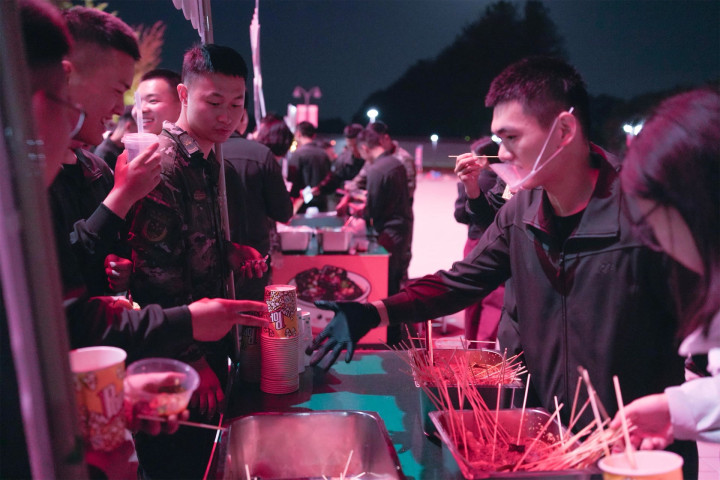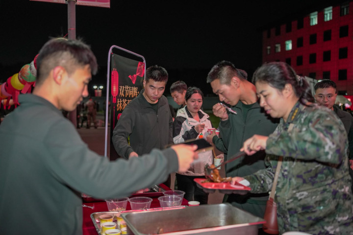 美食区的香气从开街起就萦绕营区,各式美味让人垂涎。滋滋冒油的烤肉串、外脆里嫩的炸薯条、皮薄馅足的中秋月饼一字排开,还有冰镇酸梅汤、鲜榨果汁等饮品解渴。官兵们手捧餐盘,或与战友围坐分享美食,或边吃边聊训练趣事,温热的食物入口,暖心的话语入耳,浓浓的烟火气里,满是家的温馨。